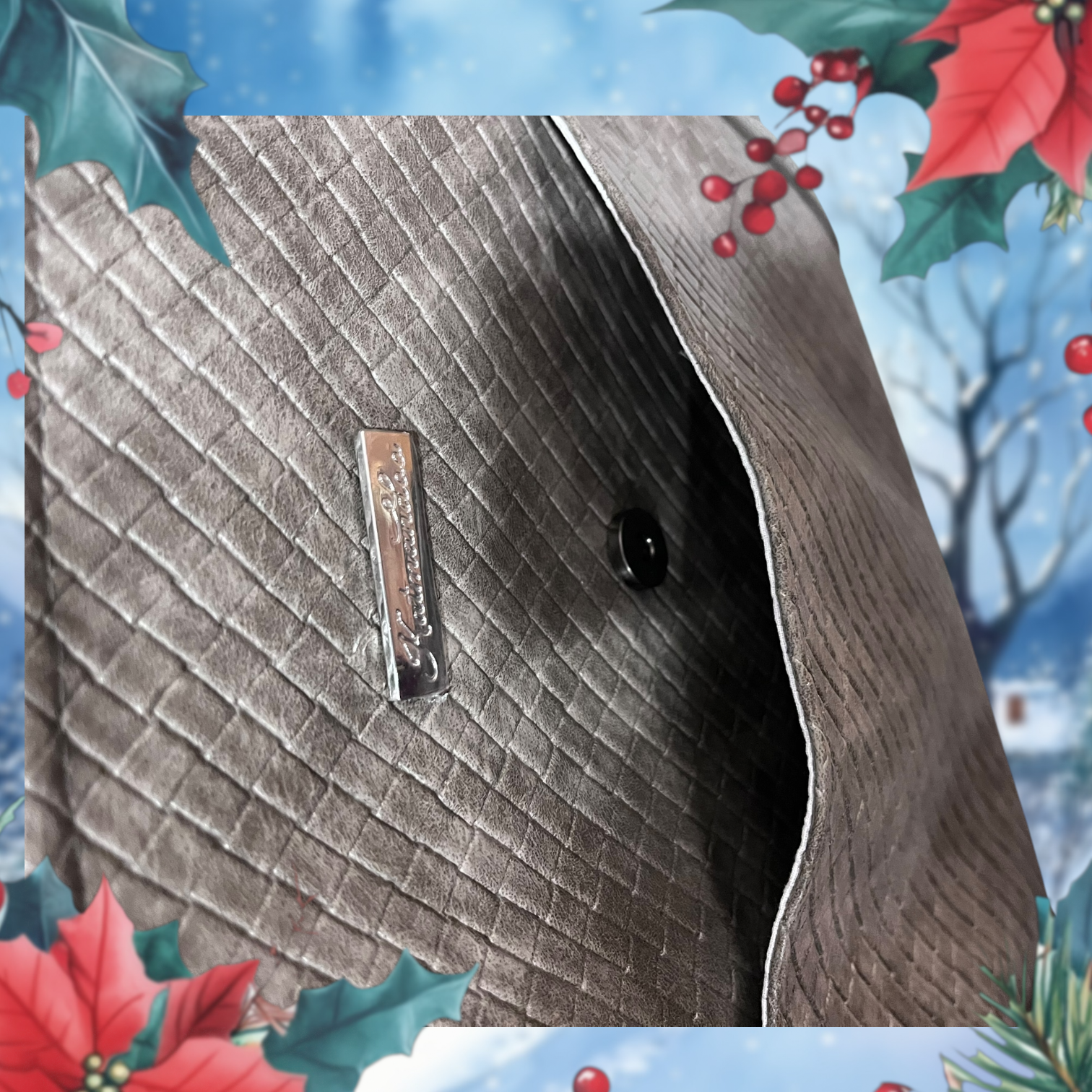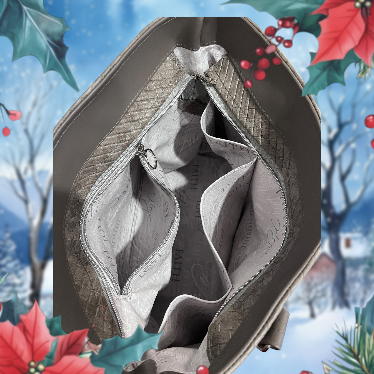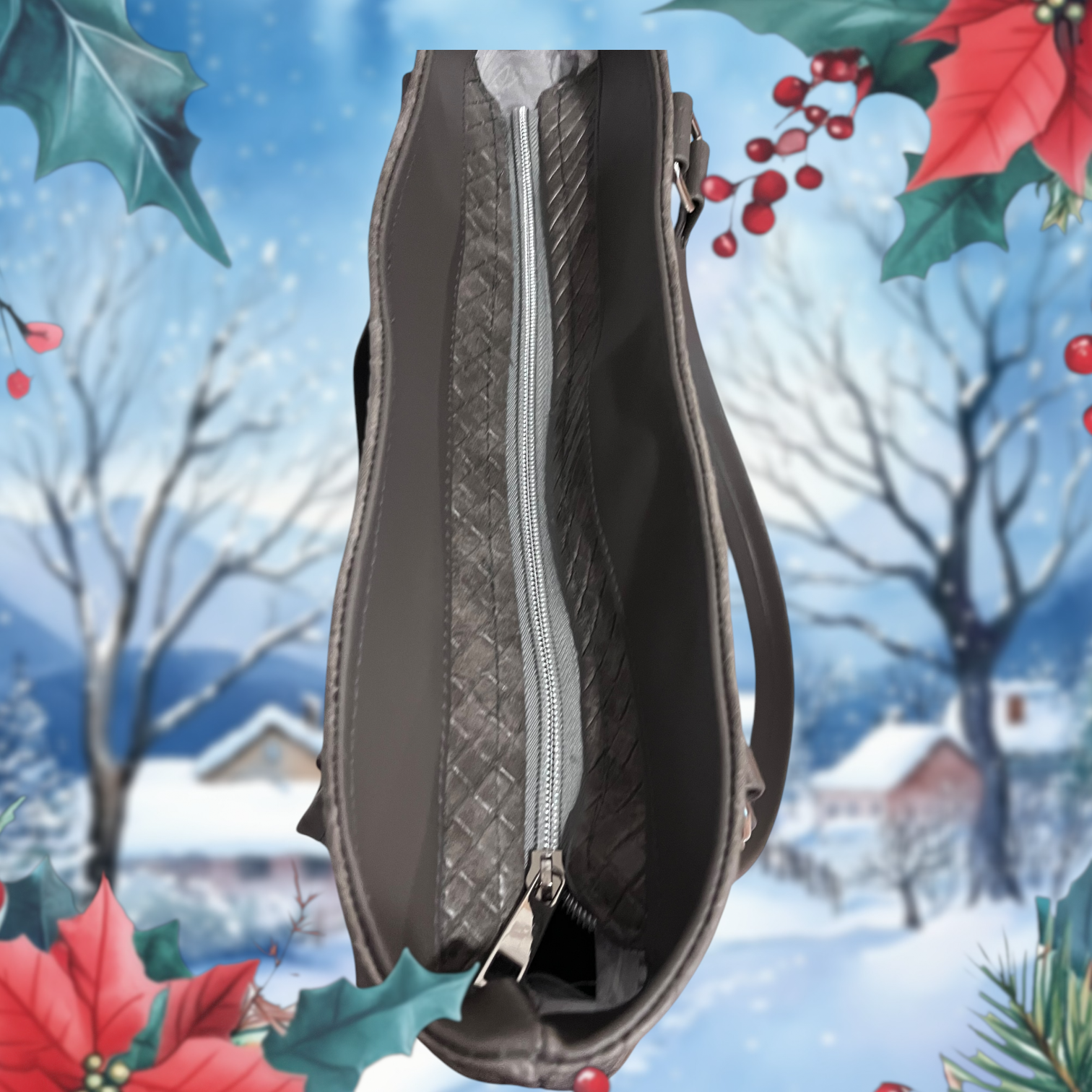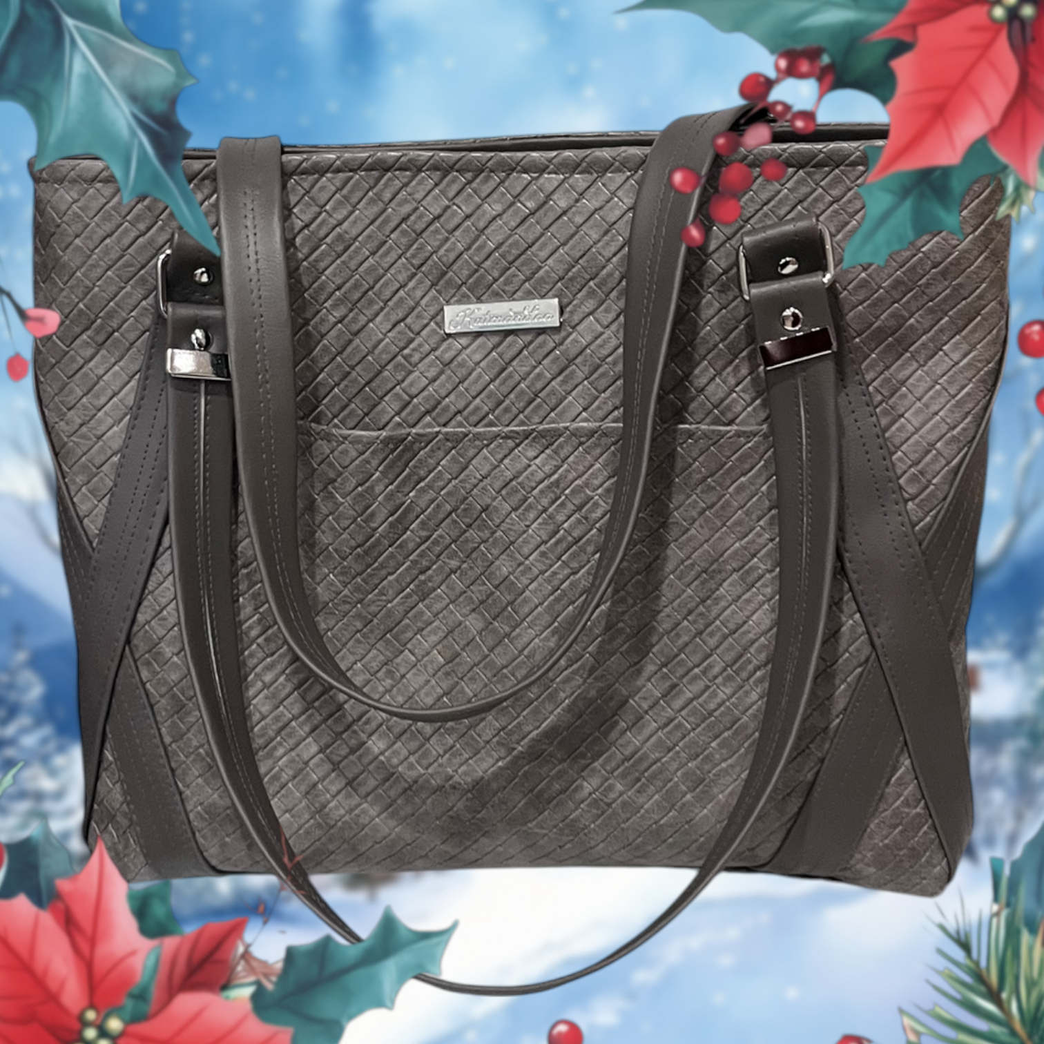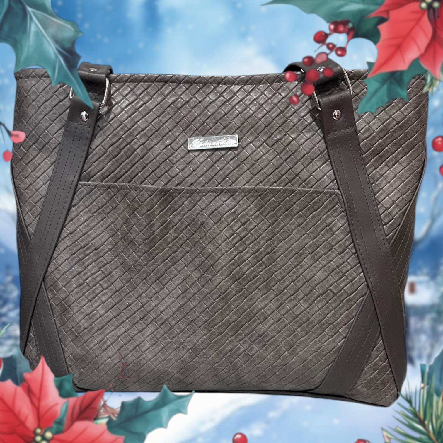 This handbag is practical, stylish, and well-organized option for everyday use. A conveniently placed slip pocket on the front, secured with a magnetic closure, ideal for quick access to a phone, keys, or other essentials. The main compartment is accessed via a zipper that is set slightly below the top edge of the bag. This provides a level of security while maintaining a clean look. Three Interior Slip Pockets help organize belongings within the main compartment, suitable for items you want to keep separate and easily accessible. One Interior Zipper Pocket offers secure storage for valuables or smaller items you want to keep contained. Small metal feet on the bottom of the bag protect the base from dirt and wear when placed on surfaces. Two handles, designed for shoulder carrying, are attached with rings to the sides of the bag. The basket weave pattern adds a subtle design element and a bit of padding. The contrasting trim highlights the edges and adds structure to the bag's design. The silver-toned accents provide a touch of sophistication and complement the gray color.