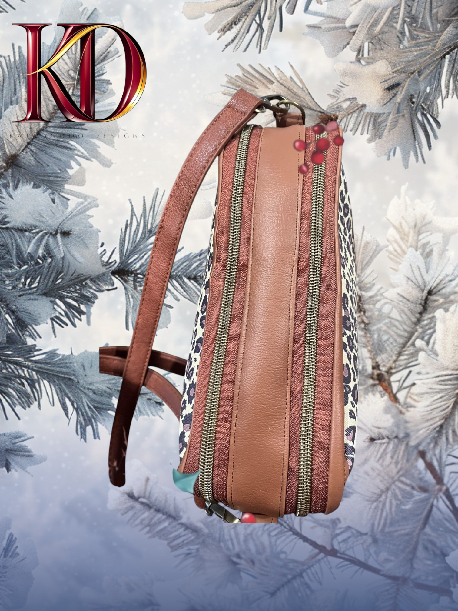 - Material specifics: Premium Leopard pattern vinyl, Light Brown contrast vinyl and 100 cotton lining, bronze hardware