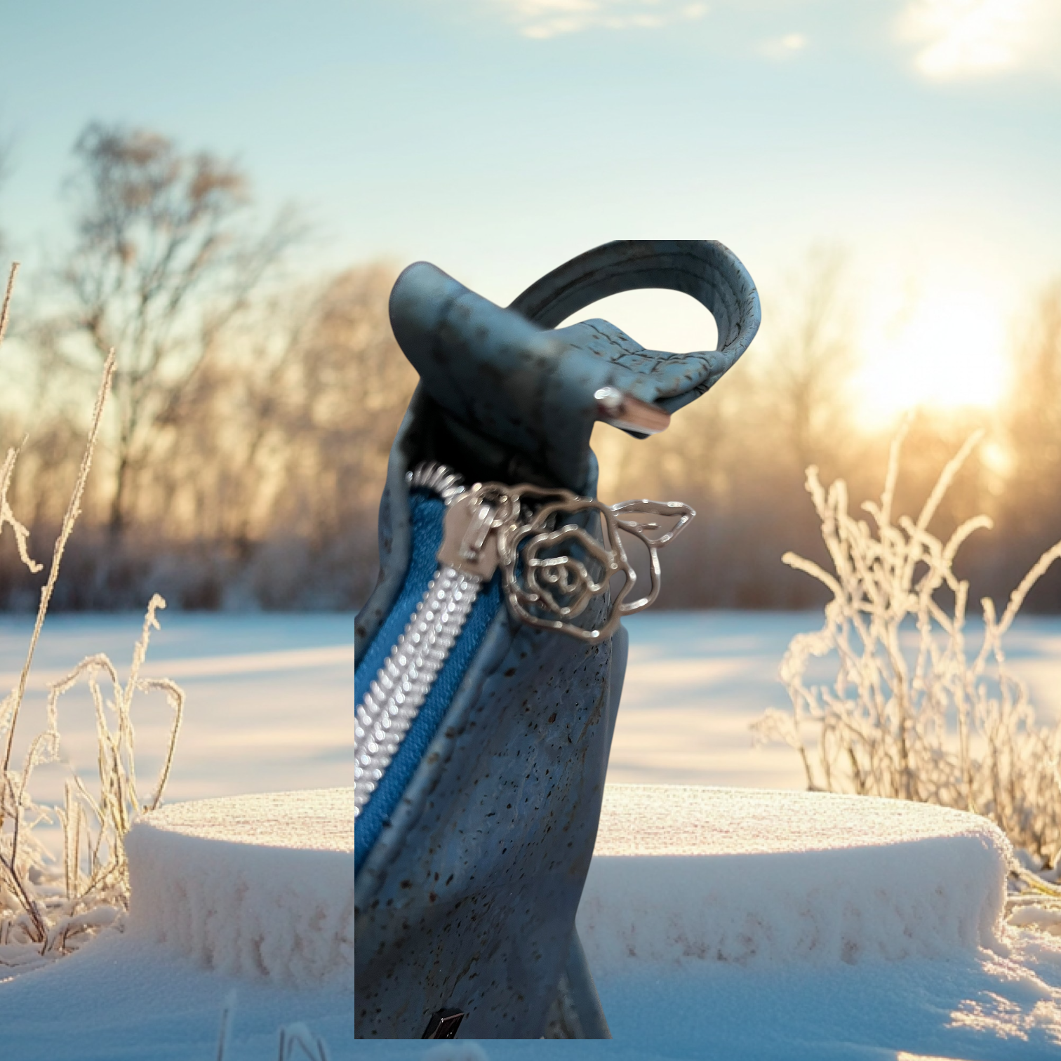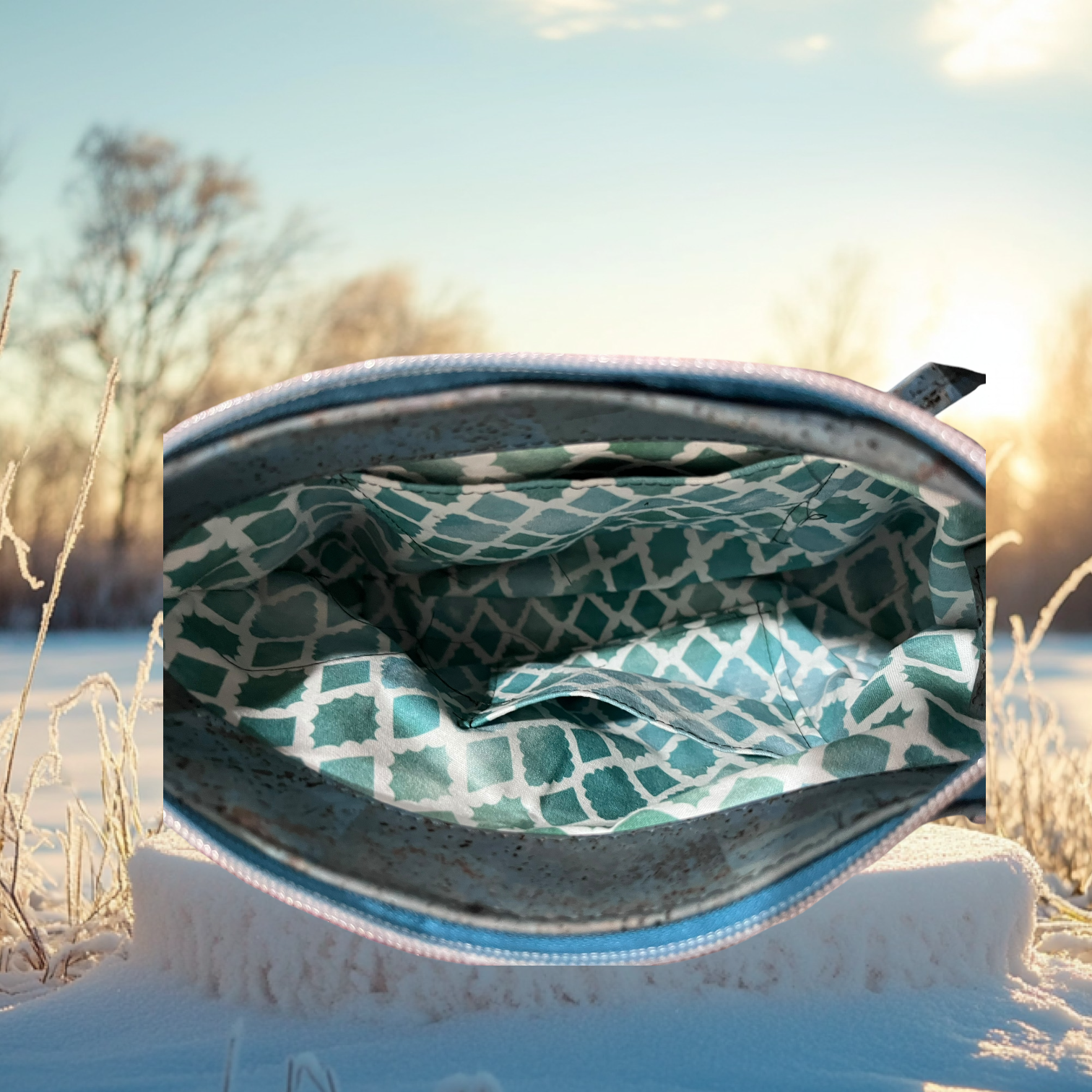 This shoulder bag is made from authentic Portuguese cork and is a stylish and practical accessory. The Teal color, textured exterior, and silver hardware give it a sophisticated look, while the interior pockets and compact size make it functional for everyday use. The patterned lining adds a unique and unexpected touch.