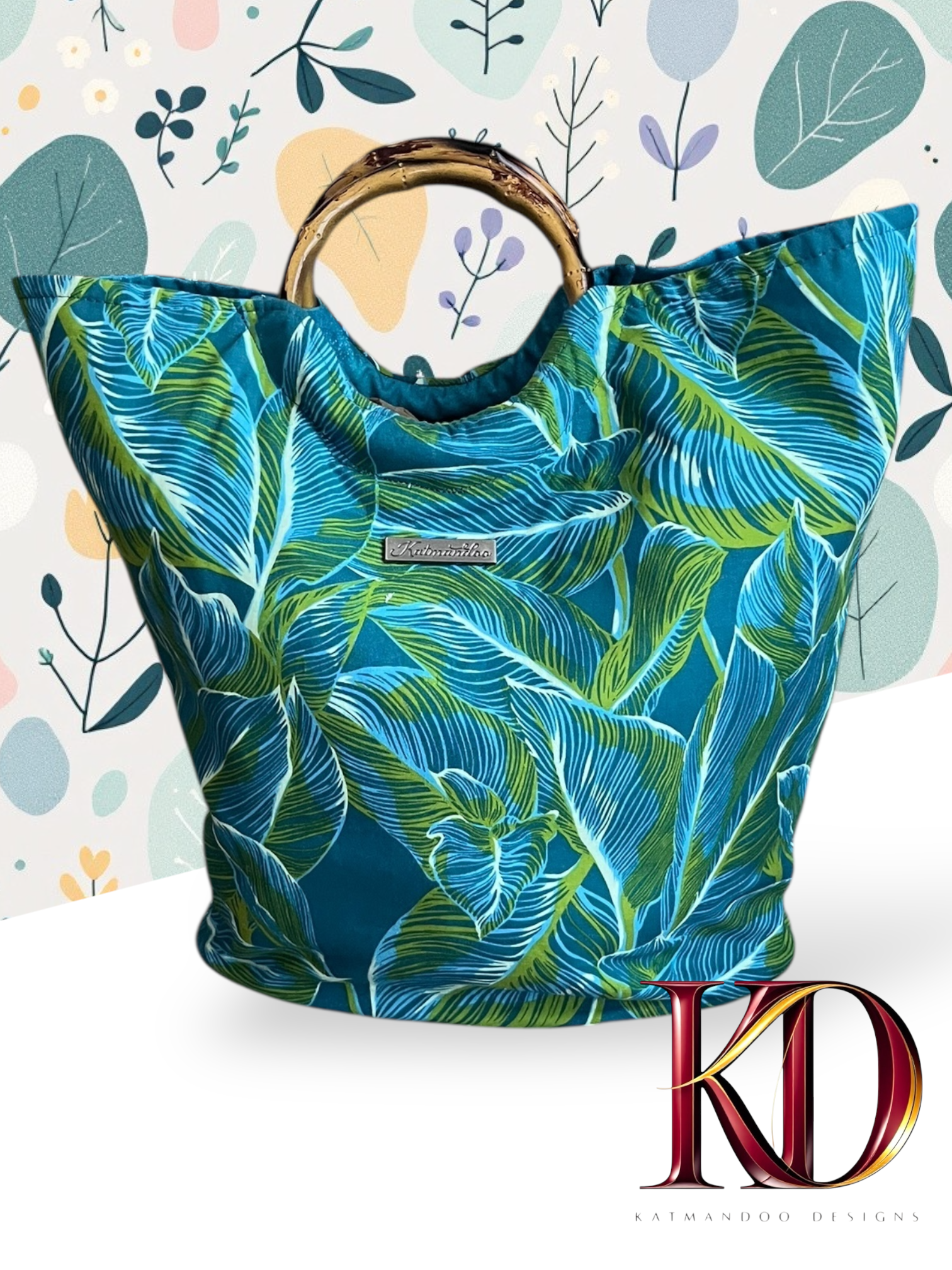 Elevate your summer style with this one-of-a-kind handmade handbag, featuring a bold and breezy tropical leaf pattern in vibrant shades of teal, blue, and green. The lush fabric is both striking and sophisticated, perfectly capturing the essence of sunny days and laid-back adventures.