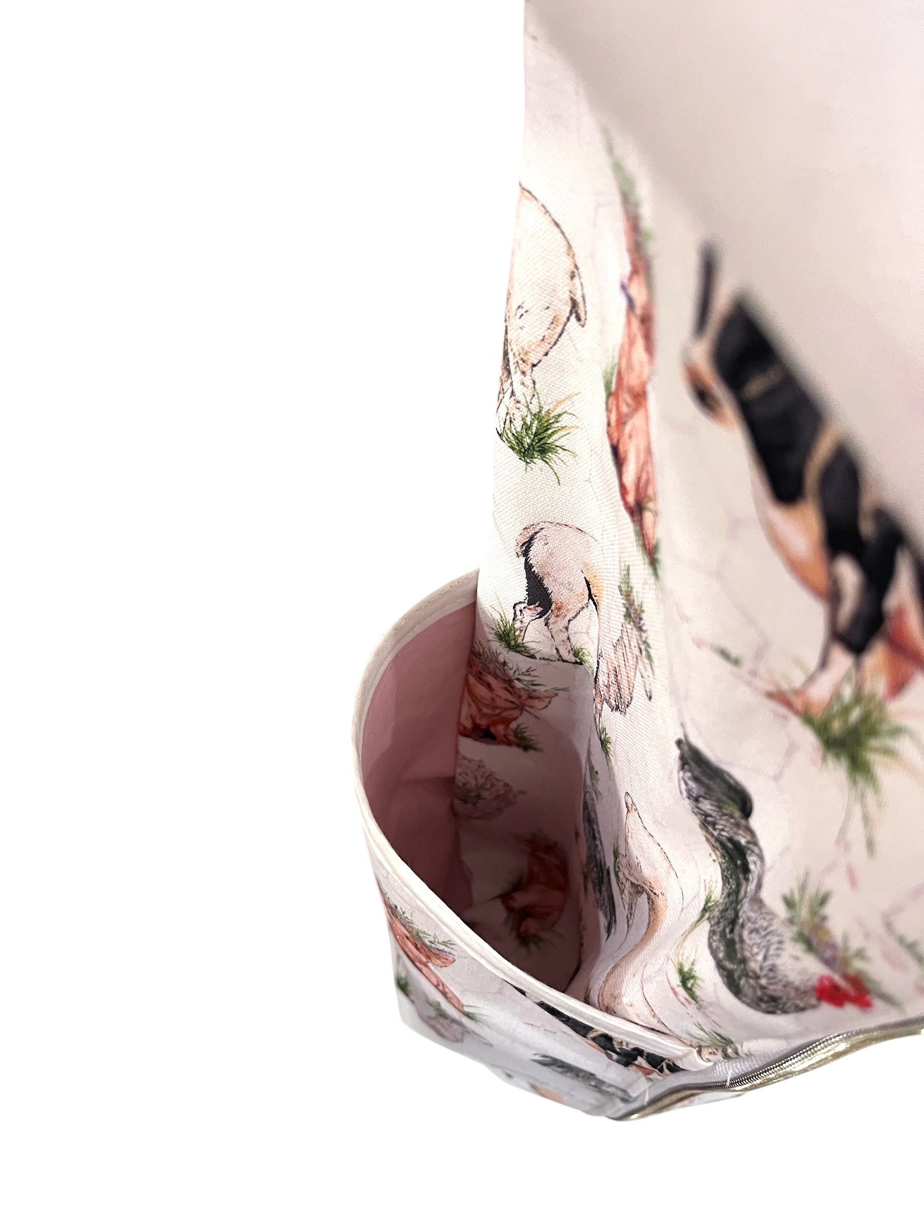 - Farm Animals and Honeycomb Design: This bag features a charming design showcasing various farm animals, including cows, pigs, chickens, and llamas, on a white background. A honeycomb pattern is subtly incorporated as an inset, and connection to nature, making it perfect for adding a touch of texture and visual interest. The design evokes a sense of tranquility yoga practitioners seeking a peaceful and calming aesthetic